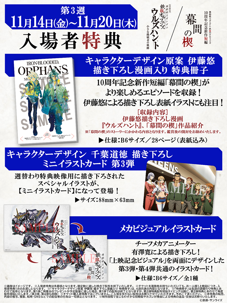 特別編集版『機動戦士ガンダム 鉄血のオルフェンズ ウルズハント -小さな挑戦者の軌跡-』/『機動戦士ガンダム 鉄血のオルフェンズ』10周年記念新作短編「幕間の楔」では、TVシリーズのキャラクター達が登場する「映画館」をテーマにした特典映像が、本編上映前に週替わりで上映されます。