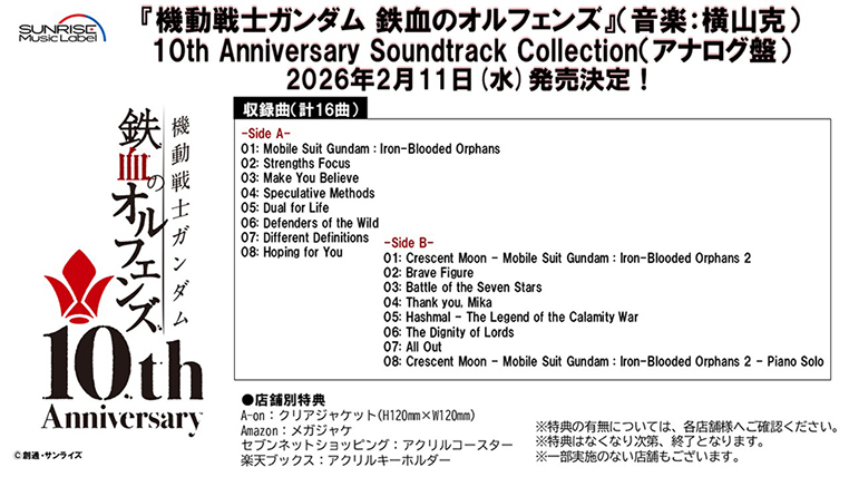 2月11日(水・祝)発売のアナログ盤「『機動戦士ガンダム 鉄血のオルフェンズ』10th Anniversary Soundtrack Collection」のジャケット絵柄が公開された。
