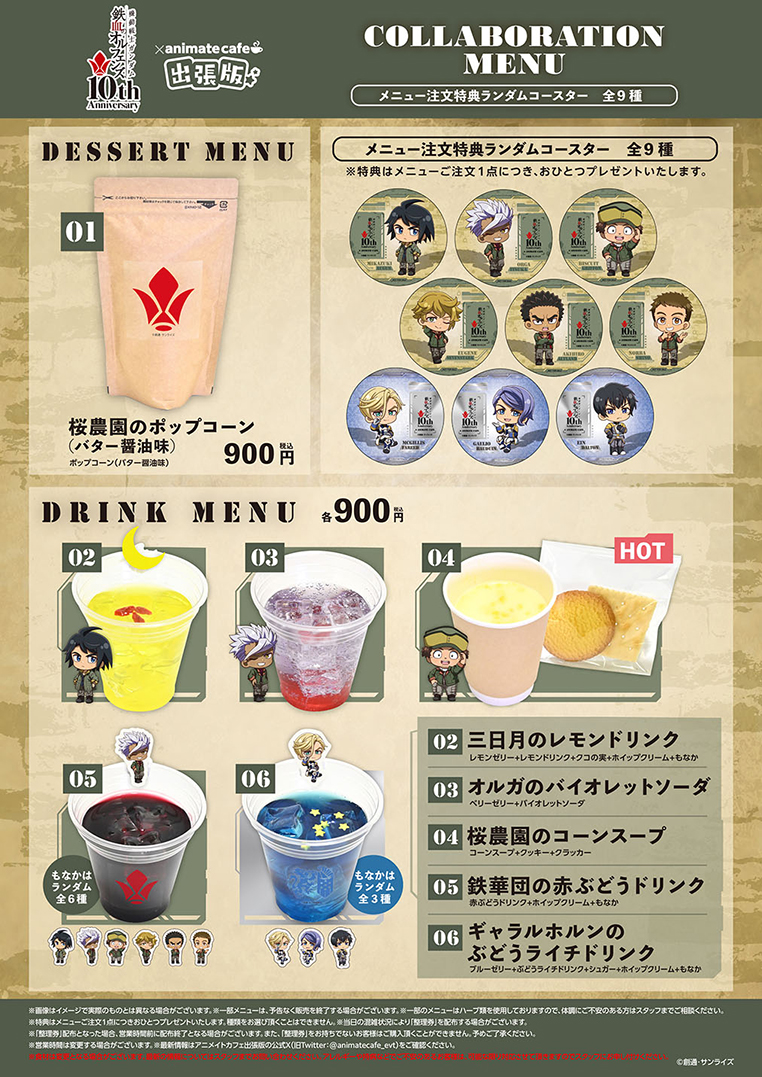 アニメイトカフェ出張版では、アニメイトカフェスタンド池袋4号店で販売予定のメニューとグッズを販売。注文特典として、1点につきランダムコースター(全9種)1枚がプレゼントされる。