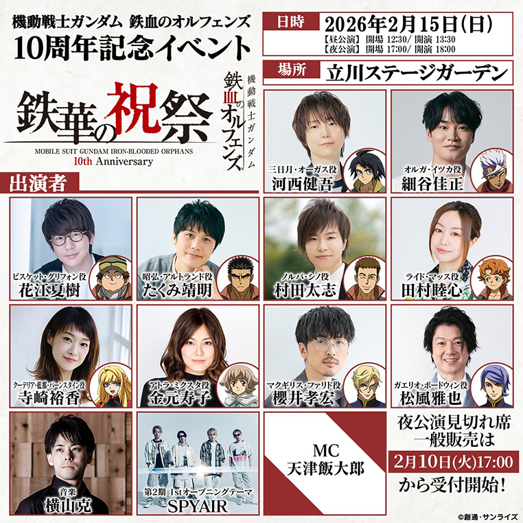 『機動戦士ガンダム 鉄血のオルフェンズ』10周年のフィナーレを飾る、TVシリーズを彩ったキャスト総勢10名が一堂に会するスペシャルイベント。出演キャストによる10周年ならではのトークや、臨場感あふれる生アフレコに加え、アーティストによる音楽ライブなど、これまで応援してくださったみなさまと再会し、そして『鉄血のオルフェンズ』への想いを再燃させる、この日限りの特別なステージをお届けいたします。