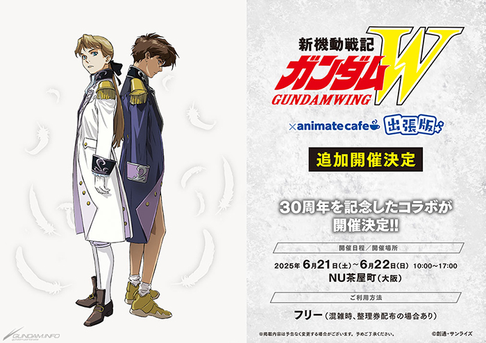 「『新機動戦記ガンダムW』×アニメイトカフェ出張版」が、6月21日(土)、22日(日)に、大阪・NU茶屋町で追加開催されることが決定した。
