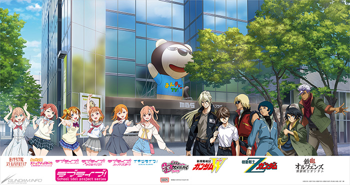 ちゃやまちをバックに、今年周年を迎える『機動戦士Ζガンダム』、『新機動戦記ガンダムW』、『機動戦士ガンダム 鉄血のオルフェンズ』、そしてラブライブ!シリーズの主要登場人物・合計12人が大集合したビジュアルを展示。