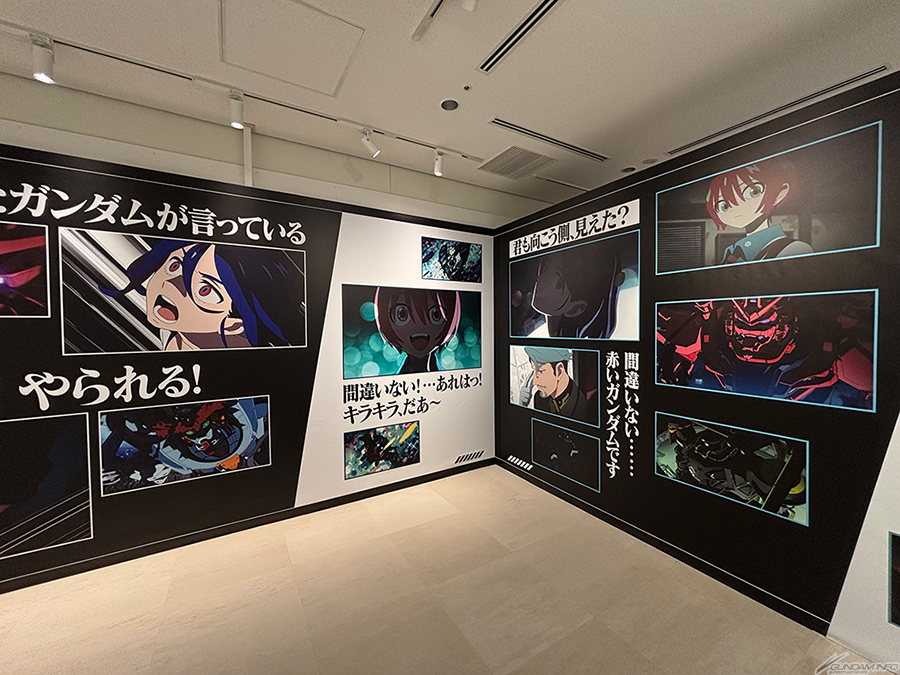 本展では、劇中の名シーンを振り返る場面カット、マチュをはじめとするキャラクターやモビルスーツのスタンディ、台本などの貴重な制作資料を展示。また、劇中に登場した改札や橋の下を再現したフォトスポットや、登場キャラのモチーフと一緒にAR撮影ができる体験コーナーも登場している。