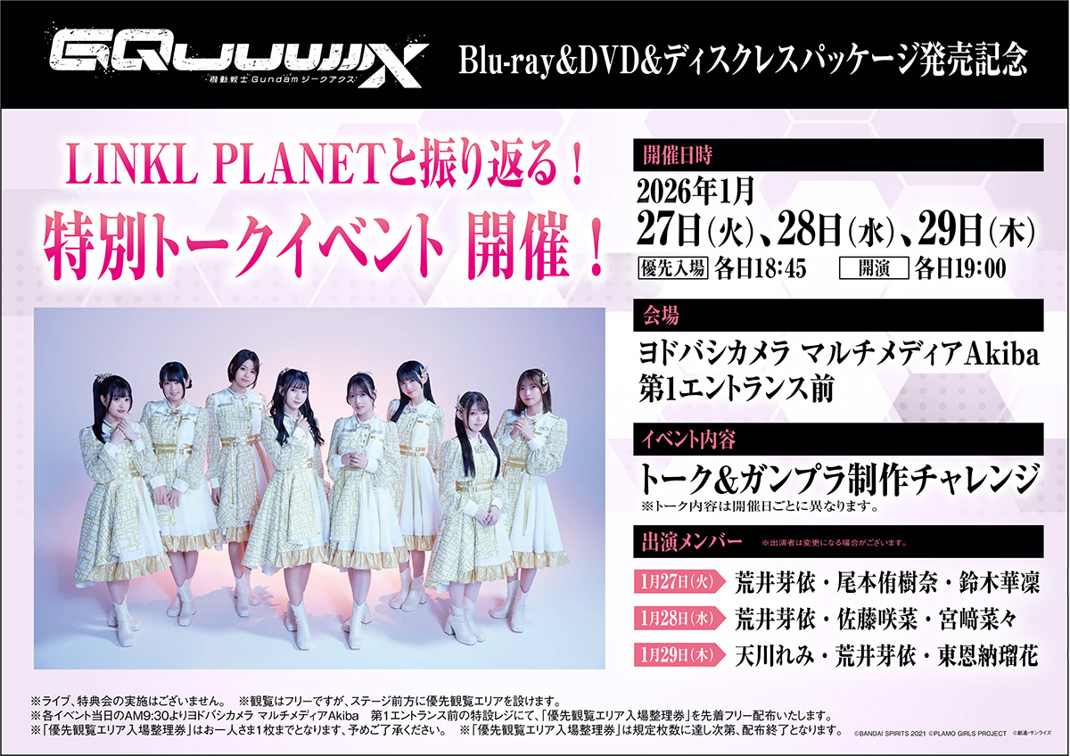 「LINKL PLANETと振り返る!特別トークイベント」は1月27日(火)、28日(水)、29日(木)の各日19:00より開催。品についてはもちろん、発売直前・直後のBlu-rayやガンプラについてトーク、またメンバーによるガンプラ制作チャレンジも実施。観覧は無料で、誰でも観覧することができる。この機会をお見逃しなく。