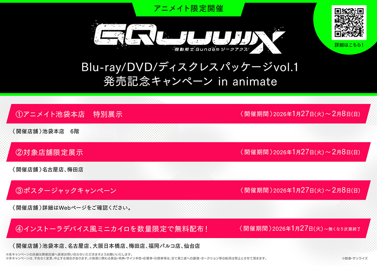 TVアニメ『機動戦士Gundam GQuuuuuuX』のBlu-ray/DVD/ディスクレスパッケージ「vol.1」が、1月28日(水)に発売されることを記念したフェアが、アニメイトにて実施されることが決定した。
