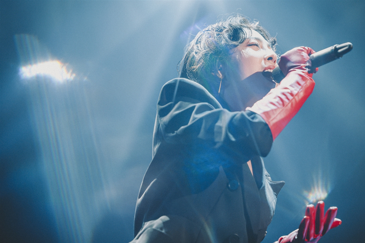 迫力ある音楽はもちろんのこと、光の演出は“閃光”という言葉がふさわしく印象的。鋭く輝く強烈な光がステージを切り取り、楽曲にあわせて変化する光の色彩が美しく煌めく。客席にまで刺さるような刺激的な光の演出に加え、ピンクにきらめく小さな三角形の光は、ギギのイヤリングを彷彿させるところなど、細やかな演出が観客の目を惹いた。