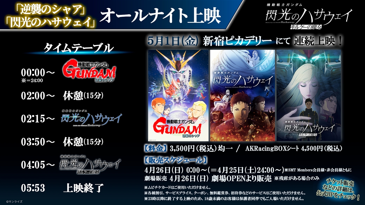 最新作『閃光のハサウェイ キルケーの魔女』と同作に繋がる2作品の計3作品を一夜で楽しめる特別な機会となっています。チケットは4月26日(日)0:00[=25日(土)24:00]より順次発売。お見逃しなく!