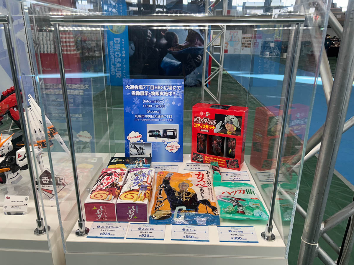会場には、物販ブースとしてフルラッピングされたコンテナも登場。「よいとまけ ガンダムver.」や「エイヒレ ガンダムVer.」をはじめとする北海道の地場企業とタイアップした商品が販売される。