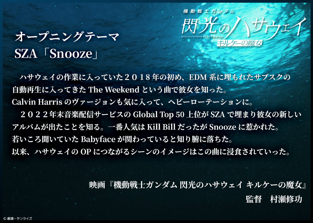 本日より全国で公開されている『機動戦士ガンダム 閃光のハサウェイ キルケーの魔女』では、オープニング・テーマにSZAの「Snooze」、エンディング主題歌にGuns N’ Roses「Sweet Child O’ Mine」が起用されている。