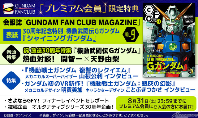 「ガンダムファンクラブマガジン Vol.9」の送付は、8月31日(土)までにGFCの“プレミアム会員”に入会し、アカウント情報で送付先を登録した人が対象となっている。まだ入会していない人は、この機会にぜひ入会しておこう。