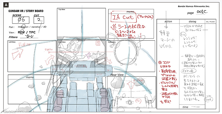 A:シーン6のバトルのチュートリアルのために描かれた絵コンテ。インタラクションパートも360度の演出を明示する必要があったので、6面の用紙が使われた。「本作はゲームではないのですが、“初回のバトルではチュートリアルが必要だ” という指摘がAtlas Ⅴから入り、チュートリアル仕立ての台詞を脚本の中に追加しました」(竹本氏)。本作はあくまで映画としてつくられているため、難しすぎず、飽きさせもしない、多くのユーザーが楽しめる最適な遊びのバランスが探られた。
