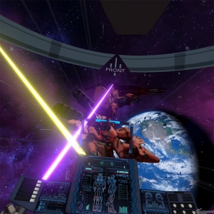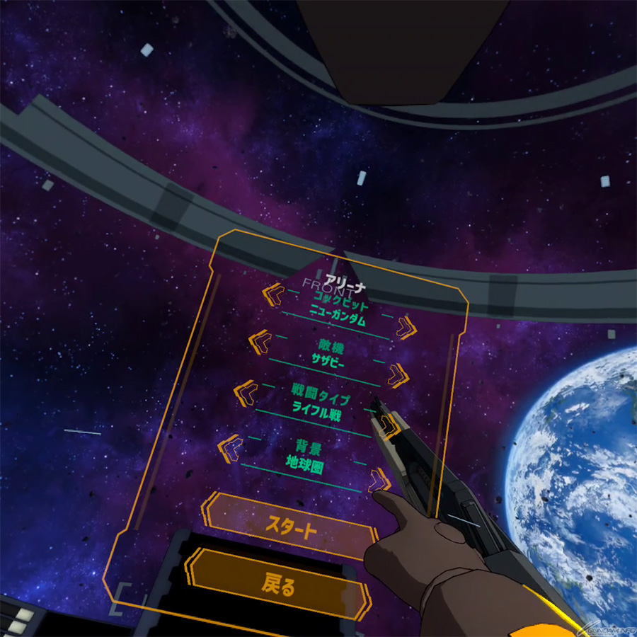 「アリーナモード」では、操縦機と敵機を選択し、ライフルおよびビームサーベルによる迫力のバトルを体感できる。ユーザーが操縦できる機体にはデルタザインとνガンダムが、敵機にはジェガン、ギラ・ドーガ、ズサ、サザビーがラインナップする。